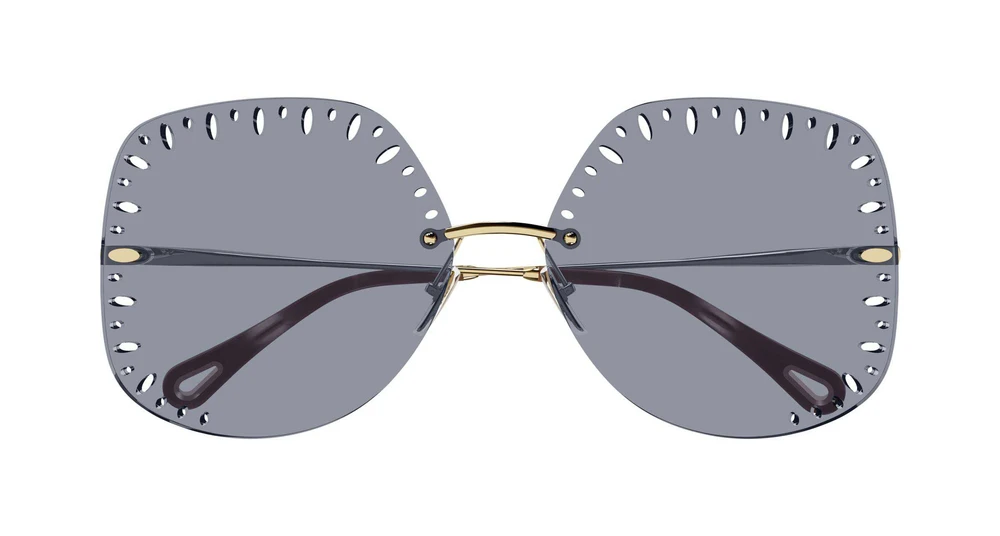 Estilo oversized quadrado sem aro, inspirado nos tecidos bordados da coleção prêt-à-porter da Chloé, conhecida como Broderie Anglaise. Caracteriza-se pelo corte a laser que vai da sobrancelha até a base da lente. Lentes em poliamida de base biológica em cores sólidas com tons veranis. Pontas das hastes em acetato de base biológica com o recorte icônico em forma de gota.
