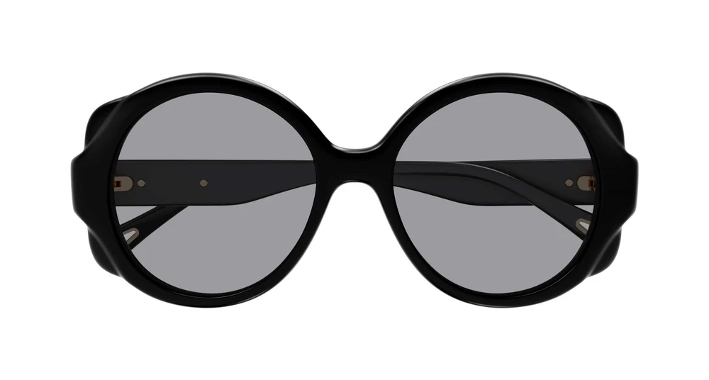Modelo redondo com detalhes em formato de concha na parte frontal da armação. Feito em RPET, plástico 100% reciclado pós-consumo. Placa com logotipo na haste, adornada com linhas em relevo estilo godron. Recorte icônico em forma de gota na ponta da haste.