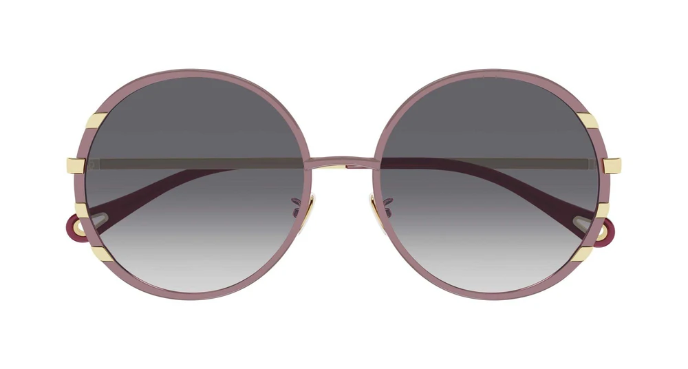 Estilo arredondado oversized em metal, com frente suavemente esmaltada em tons suaves. Listras douradas em relevo na parte frontal conferem um toque luminoso. Ponteiras das hastes em bioacetato com o icônico recorte em forma de gota.
