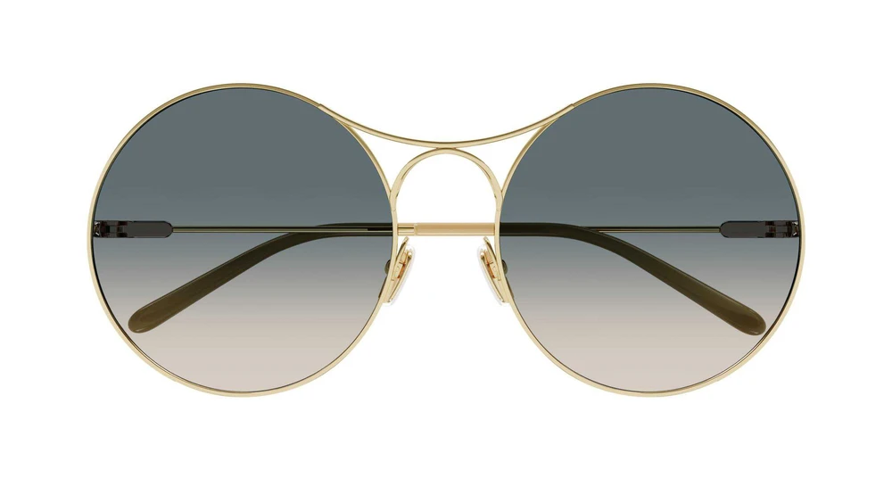 Armação redonda com dupla ponte, confeccionada em metal ultraleve. Combinação de galvanizações clássicas com metal colorido feminino, complementada por uma elegante placa oval com o logo Chloé em cor contrastante para maior destaque.