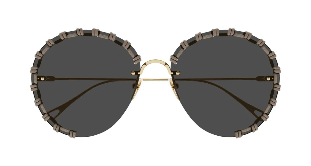 Estilo piloto arredondado em construção sem aro, com costura artesanal em couro ao redor da lente. Hastes metálicas extrafinas em dourado claro, com uma discreta placa de logotipo e uma versão repaginada e leve da icônica gota na ponta da haste.