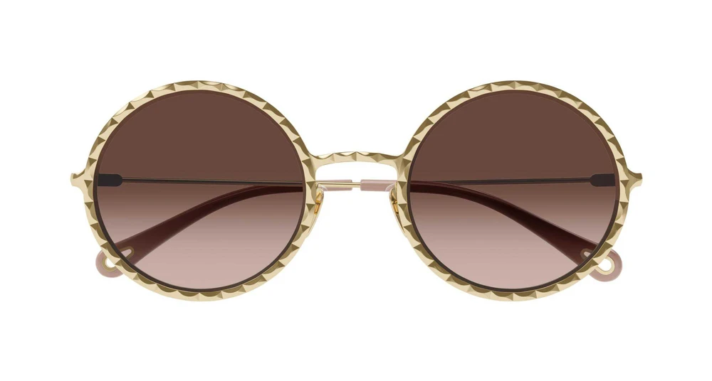 Armação redonda em metal com delicado efeito recortado fresado na borda. Chloé dourado claro combinado com lentes coloridas com degradê duplo. Ponta da haste em acetato adornada com detalhes em metal Chloé na ponteira.