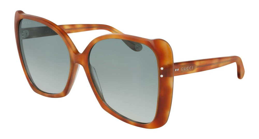 Formato borboleta em acetato artesanal, rebitado e polido à mão para criar uma aparência leve, suave e oversized. Logotipo Gucci em letras e rebites nas hastes; logotipo GG entrelaçado na parte interna das ponteiras. Paleta de cores feminina e elegante.