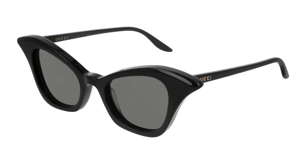 A estética dos modelos do desfile Cruise PRIM/VER 2020 foi interpretada em formatos vintage. Formato gatinho, extremo e feminino em acetato. Logotipo Gucci escrito nas hastes. Paleta de cores eclética de um preto clássico a um tom madrepérola vermelha brilhante listrada de camada dupla.