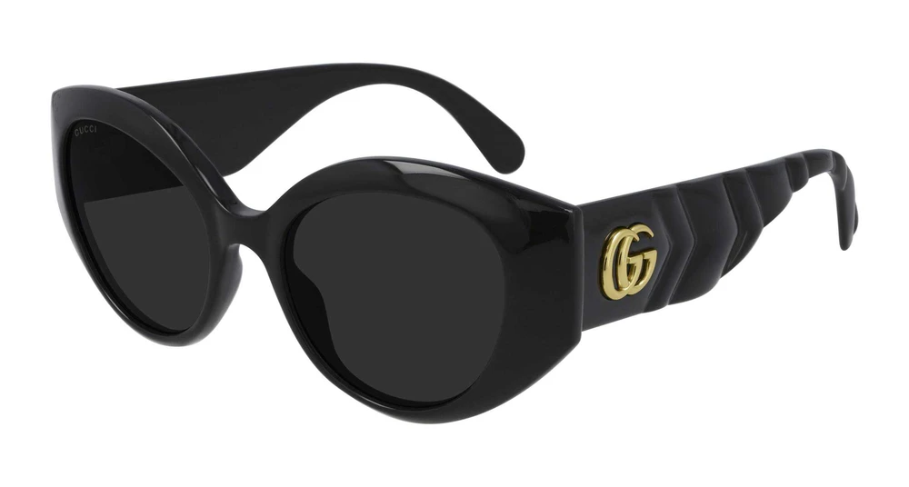 Nova linha fashion que expressa plenamente o estilo icônico e elegante da Gucci, diretamente ligada à bolsa Marmont. Formato gatinho arredondado, elegante e sofisticado, com destaque para a decoração matelassé nas hastes, que transmite a sensação de maciez típica dos artigos de couro da Gucci. Logotipo “running” da Gucci nas hastes.
