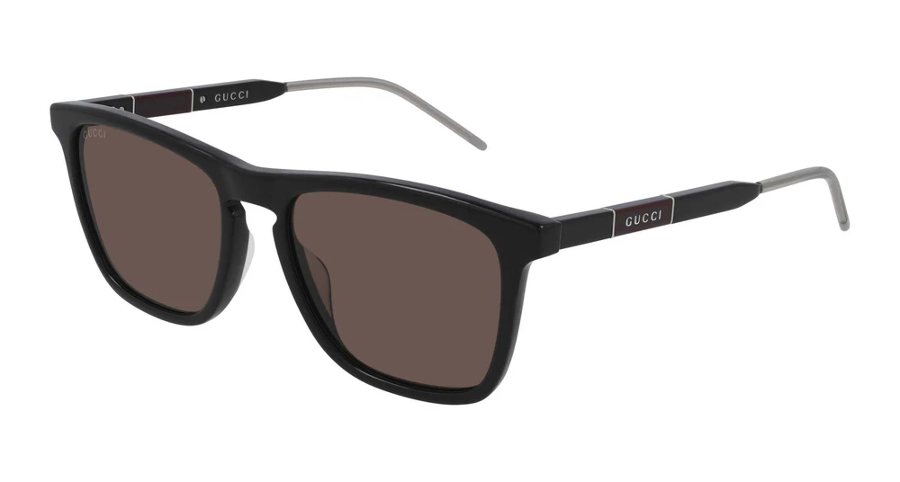 Conceito masculino da Gucci Eyewear renovado de forma mais leve e sutil, com uma combinação sofisticada de materiais e cores. Formato retangular atemporal em acetato, com destaque para a ponte em formato de fechadura (keyhole). Logotipo Gucci em letras, gravado em uma placa colorida de tom masculino nas hastes.