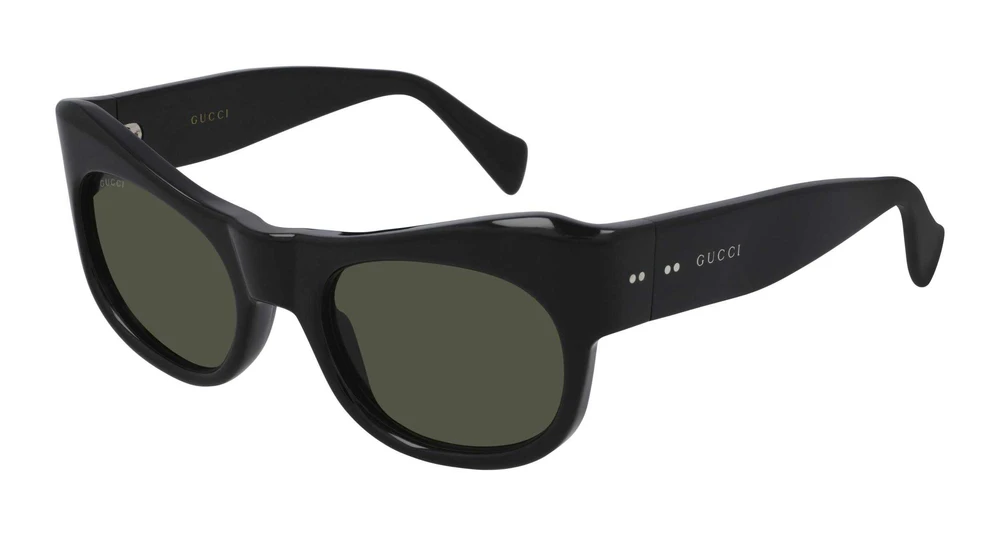 Estilo vintage inspirado nos anos 50. Modelo masculino em formato gatinho, caracterizado por dimensões marcantes na parte frontal e rebites nas hastes. Logotipo Gucci em letras nas hastes.