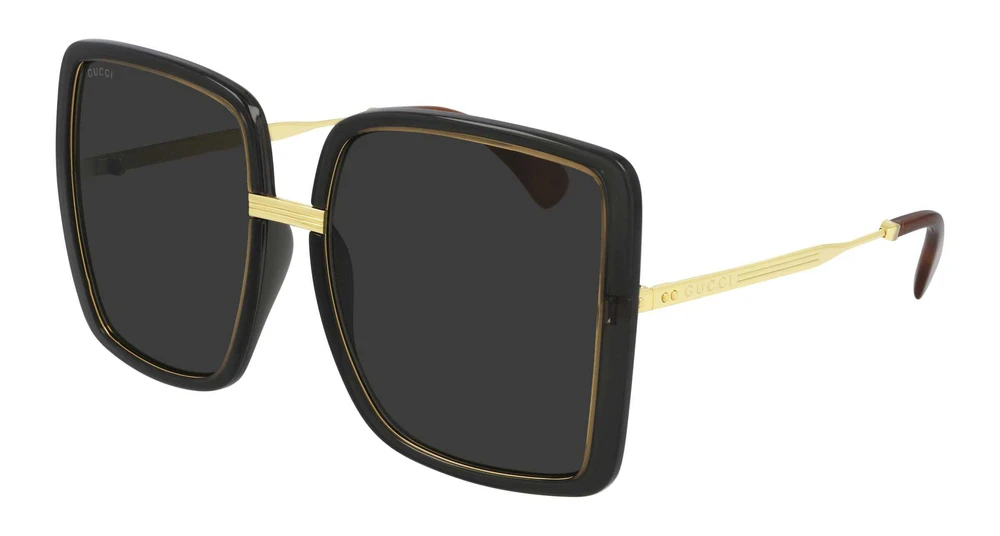 Em tamanho extragrande e extremamente descolado, este conceito é marcado pela combinação do metal e do plástico em um jogo de luz que cria contrastes e transparências. Formato quadrado extragrande com aros de acetato aplicados em uma estrutura de metal com hastes finas de metal. Plaqueta enriquecida com metal gravado para um toque sofisticado. Hastes ornamentadas com rebites icônicos, logotipo Gucci escrito e decorações geométricas. Aros brilhantes transparentes combinados com lentes de verão femininas e ponta da haste em havana clássico.