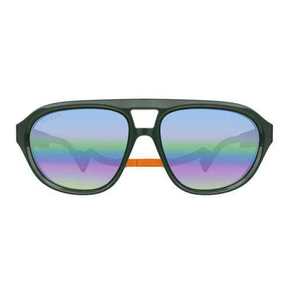 De inspiração esportiva e vintage, este modelo piloto é feito inteiramente em plástico com o logotipo Gucci em ambas as hastes com uma ponteira G vazada única para prender a corrente exclusiva com o logotipo Gucci escrito nela. O modelo vem com uma proposta de cores bem equilibrada: do clássico ao esportivo com lentes espelhadas para as REF. mais direcionadas à imagem.