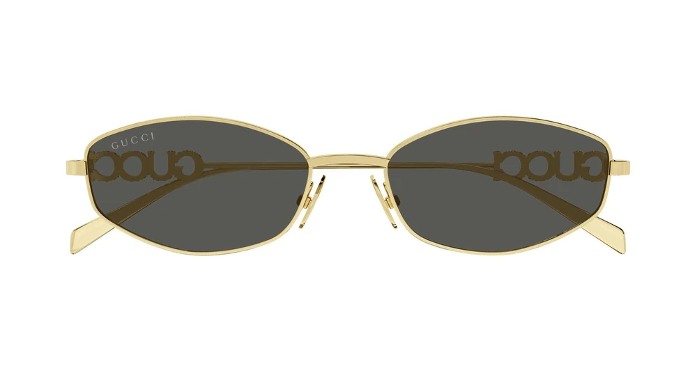 Estilos em metal caracterizados pelo logotipo Gucci tridimensional em letras nas hastes. Formato amendoado estreito. Referências modernas e descoladas apresentando lentes Guccissima e lisa.