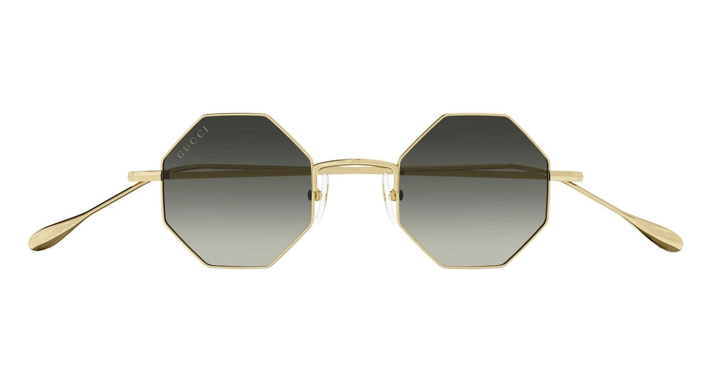 Lançado na cruise collection SS24, esses estilos em metal foram reforçados com novos formatos e cores. Formato hexagonal. Logotipo Gucci em letras nas hastes. Paleta de cores descontraída e de verão, apresentando diversas cores degradê.