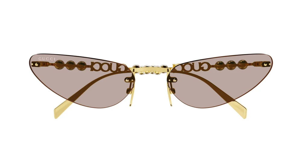 Estrutura feminina chique e preciosa caracterizada por uma haste fina de metal decorada com pérolas que emolduram o logotipo recortado Gucci. Formato gatinho estreito glasant. Logotipo em letras Gucci recortado nas hastes. Estruturas em metal dourado e prateado combinadas com lentes escuras e coloridas.
