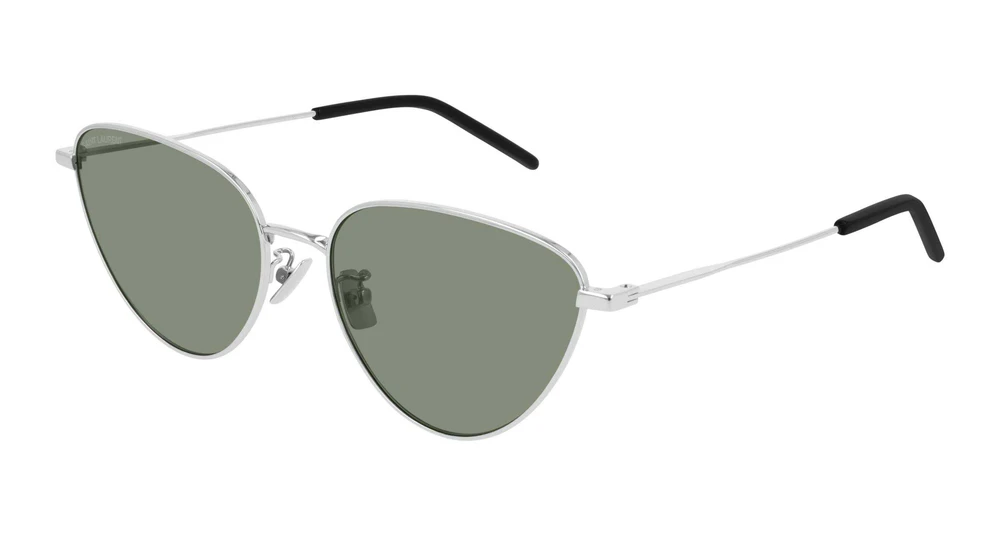Nova armação cat-eye em metal leve com aro padrão, complementando a atual oferta da marca e acompanhando a tendência dos óculos metálicos. Disponível em uma ampla variedade de cores, incluindo a icônica paleta metálica da Saint Laurent e um novo tom feminino de rosa monocromático com lentes combinando. Logotipo SAINT LAURENT gravado a laser em ambas as hastes.