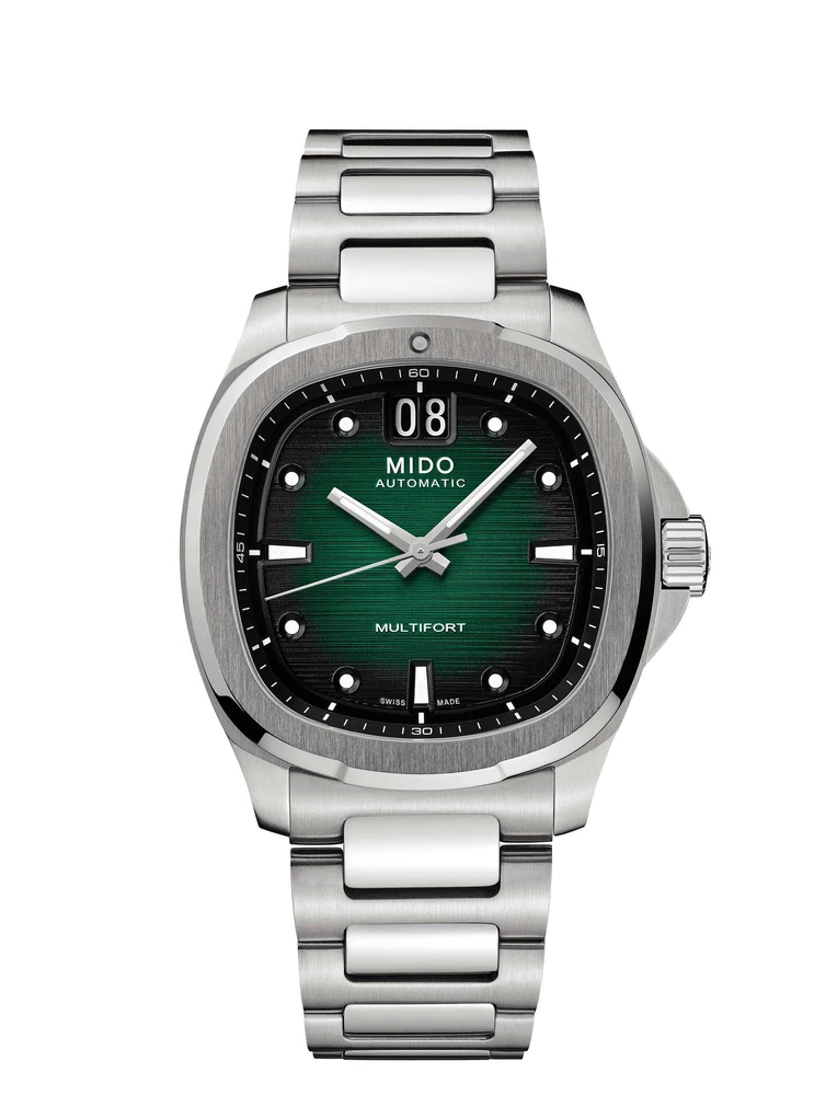 Um retorno brilhante! Nascido do extraordinário legado da MIDO, o formato de caixa em estilo TV volta ao centro das atenções com o Multifort TV Big Date — tão intenso quanto preciso, graças ao seu formidável movimento mecânico. O design moderno e dinâmico deste relógio suíço é realçado pelo mostrador com acabamento escovado horizontal marcante e por sua função distintiva: o BIG DATE às 12 horas. Seu poderoso movimento automático de última geração, o Calibre 80, é equipado com uma espiral de balanço em Nivachron™, oferecendo resistência excepcional a choques e campos magnéticos.
