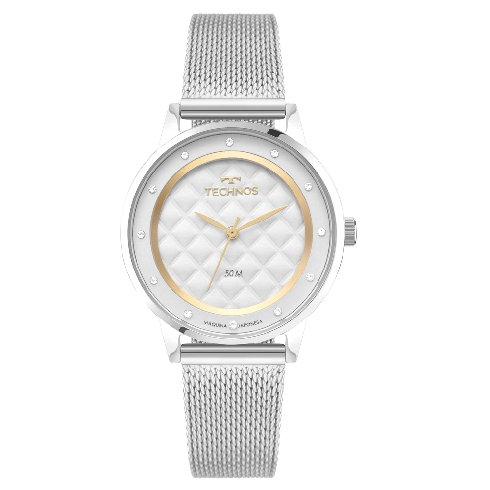 Relógio Brilho apresenta um novo lançamento com design moderno e versátil, com pulseira de aço inoxidável em mesh. Seu mostrador na cor prata conta com várias novidades, como textura matelassê, aplicação de aro metalizado e aplicação de pedras. Produto 100% em aço inoxidável, banhado em prata, com máquina quartz Japonesa Miyota e resistência à água de 50 metros.