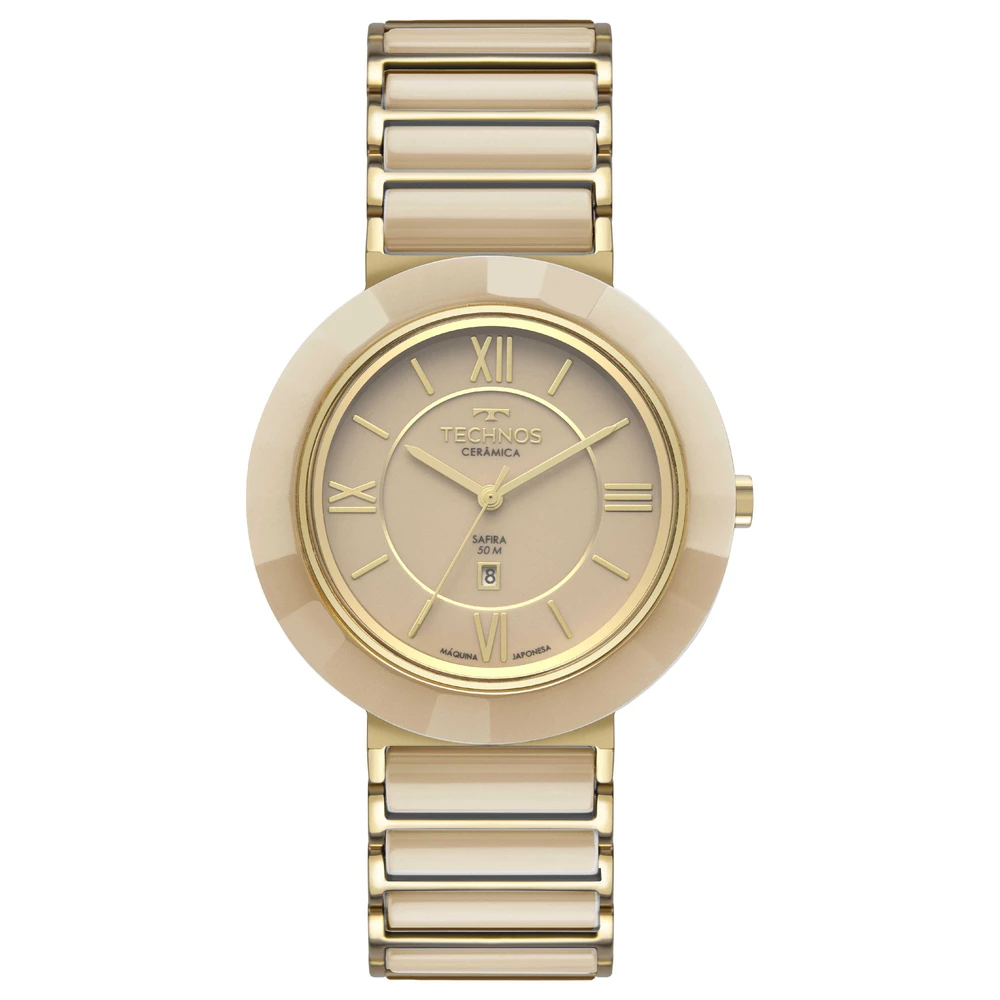 Relógio Ceramic apresenta um novo lançamento de design sofisticado, definido pela lente de safira e aplicação de cerâmica. Sua caixa redonda e seu mostrador na cor bege contam com assinatura de linha e numeração romana nos marcadores de hora, além do aro facetado de cerâmica. Sua pulseira é complementada por aço inoxidável e aço com cerâmica. Produto 100% em aço inoxidável, banhado em dourado, máquina quartz Japonesa Miyota e resistência à água de 50 metros.
