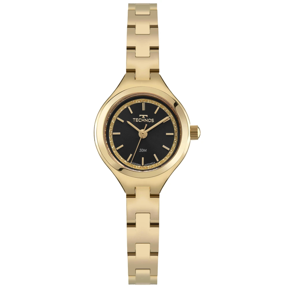 Relógio Technos Mini apresenta seu novo modelo, inovador e sofisticado. Sua nova caixa, pequena e delicada na cor dourado, possui uma construção diferenciada. Ele oferece o requinte da pulseira sólida, estruturada com fecho de joia. Seu mostrador de design minimalista na cor preto conta com a aplicação de detalhes de brilho por todo o aro interno. Produto 100% em aço inoxidável, banhado em dourado, com pulseira em 3 links, banhado em dourado, máquina quartz Japonesa Miyota e resistência à água de 50 metros.
