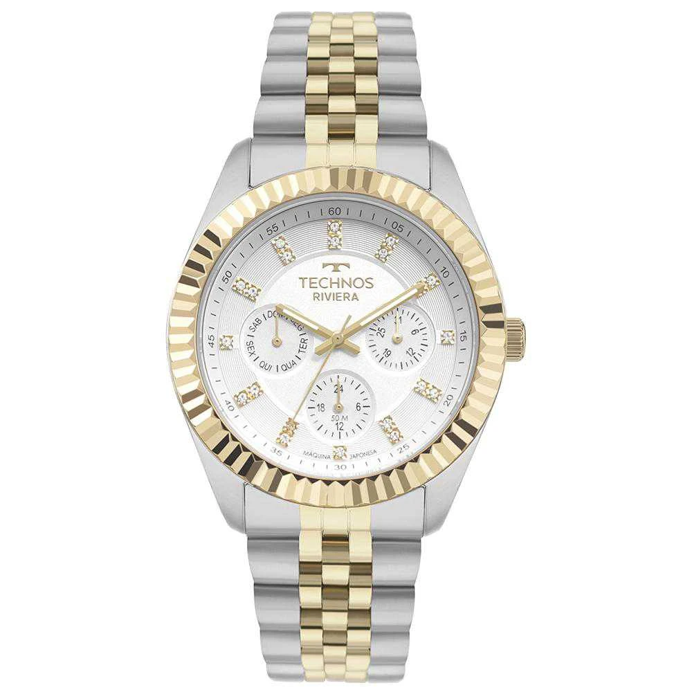 Relógio Technos Riviera feminino com design clássico, pulseira de aço inoxidável em 7 links e aro externo corrugado. Seu mostrador conta com assinatura de linha, aplicação de pedras nos marcadores de hora e aro interno com marcação dos minutos. Produto 100% em aço inoxidável, com máquina quartz japonesa Miyota multifunção e resistência à água de 50 metros.