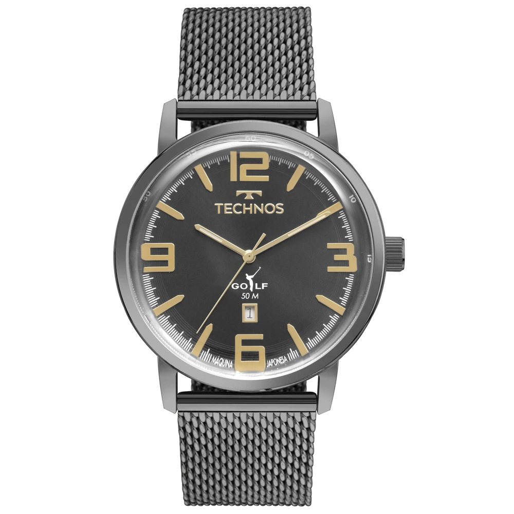 A linha Technos Golf traz a elegância esportiva em seus novos lançamentos. A lente com acabamento abaulado entrega sofisticação, enquanto a presença de grandes números arábicos nas posições de 3/6/9/12 horas, mostrador grafite e a assinatura de linha personalizada oferecem a clássica estética esportiva. Com resistência à água de 50 metros, ele ainda apresenta uma pulseira de aço inoxidável em mesh e tamanho de caixa de 46mm que reforça o visual moderno da peça.