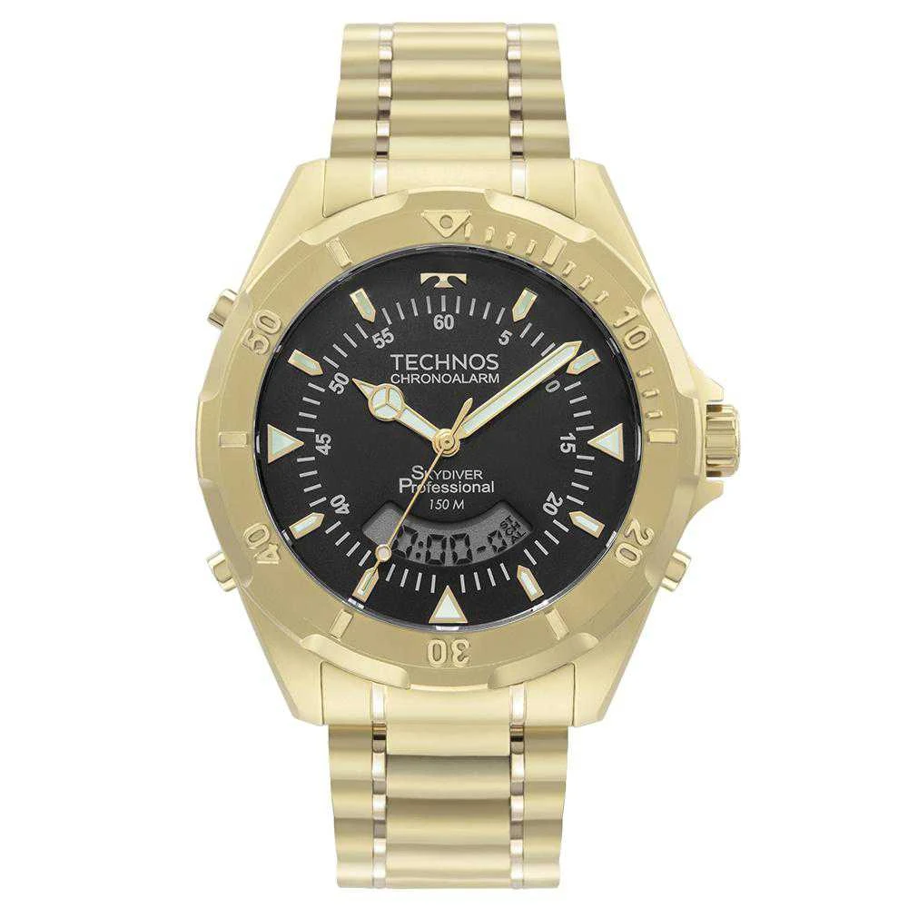 Relógio Technos Skydiver apresenta seu novo lançamento, de maquinismo anadigi com novo módulo exclusivo com 4 baterias, oferecendo maior durabilidade ao relógio, e com aro giratório unidirecional. Além disso, ele apresenta mostrador de fácil leitura com marcadores de hora luminescentes, além de cronógrafo e aro corrugado. Produto 100% em aço inoxidável, com pulseira de aço inoxidável em 3 links, com resistência à água de 150 metros.
